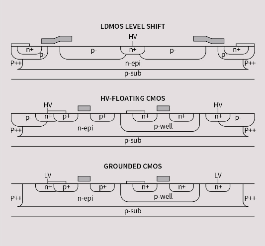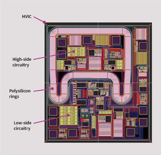 利用這種混合信號(hào)hvic技術(shù),可以實(shí)現(xiàn)高壓電平變換電路和低壓模擬和數(shù)字電路。通過將高壓電路(在由多晶硅環(huán)形成的‘阱’中)放置在600個(gè)V或1200 V上,在同一個(gè)硅上遠(yuǎn)離低壓電路的其余部分,高邊功率MOSFET或IGBT存在于許多常見的離線電路拓?fù)渲?,例如降壓、同步升壓、半橋,全橋三相?/span>