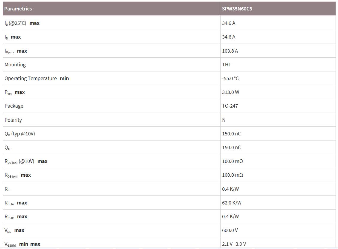 場效應(yīng)管SPW35N60C3的參數(shù):