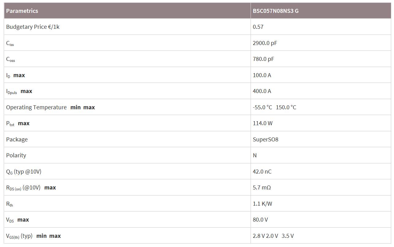MOS管BSC057N08NS3 G的參數(shù):