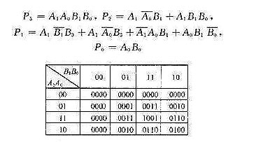 兩位乘法器能夠?qū)崿F(xiàn)2位二進(jìn)制數(shù)乘法運(yùn)算,設(shè)A1A0,B1B0為乘數(shù)和被乘數(shù),P3P2P1P0為乘法運(yùn)算得到的積,兩位乘法器的輸出邏輯函數(shù)表達(dá)式分別為: