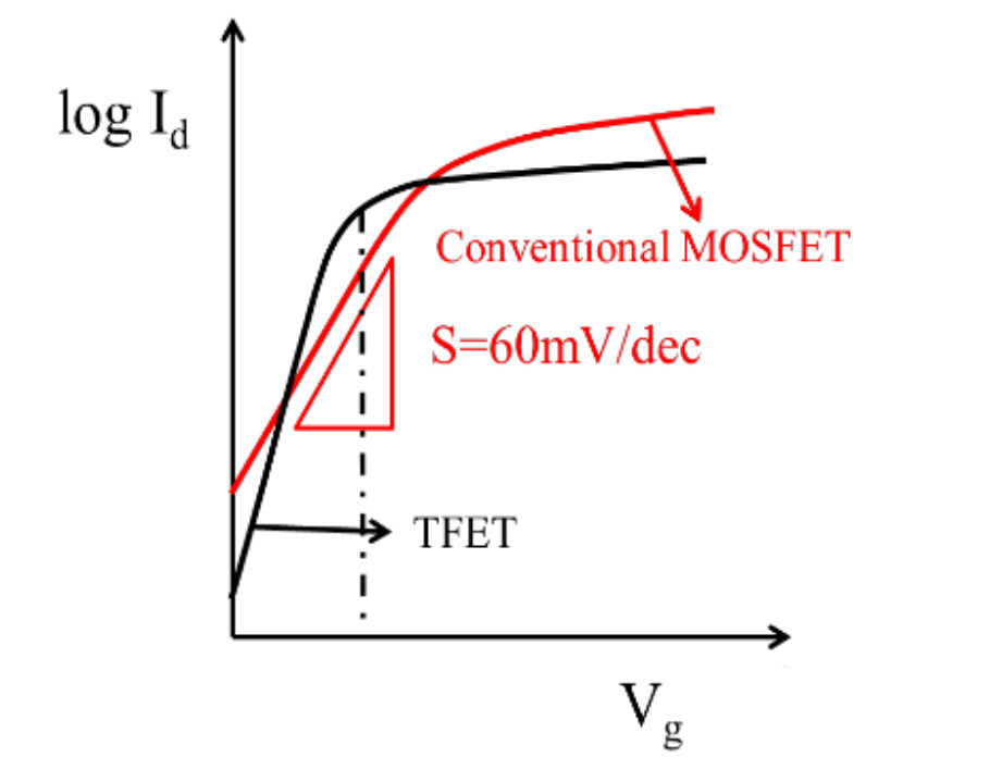 帶間隧穿,S可突破60mV/decade限制,Ioff很低,它的工作電壓可再降低;